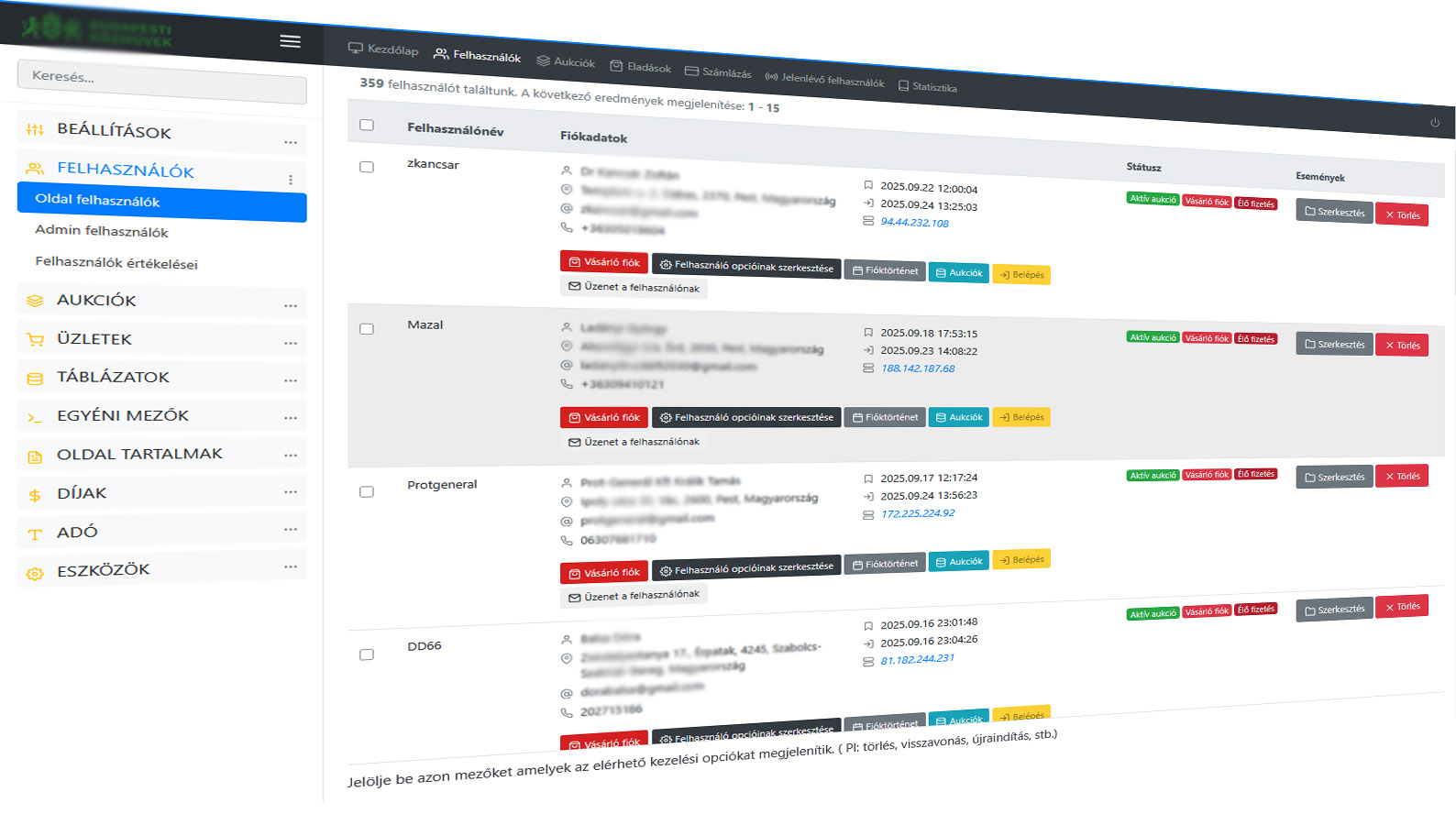 Regisztrált tagok adatai, státusza (aktív, felfüggesztett, ellenőrzött eladók)